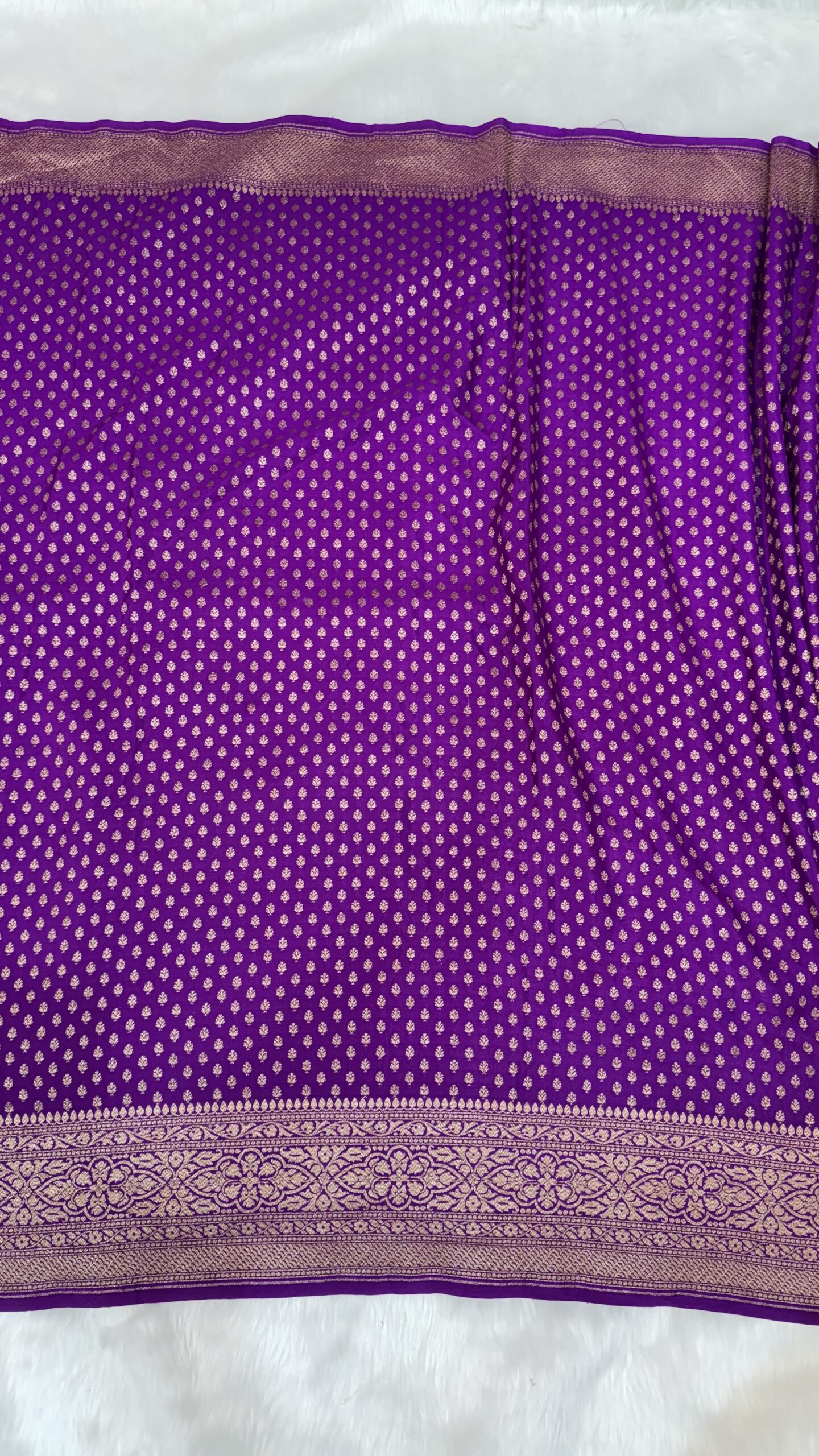 This exquisite saree is crafted from luxurious Italian Crape Georgette, known for its lightweight drape and elegant texture. The deep royal purple hue is beautifully complemented with antique golden zari weaving, making it perfect for festive occasions, weddings, and special celebrations.