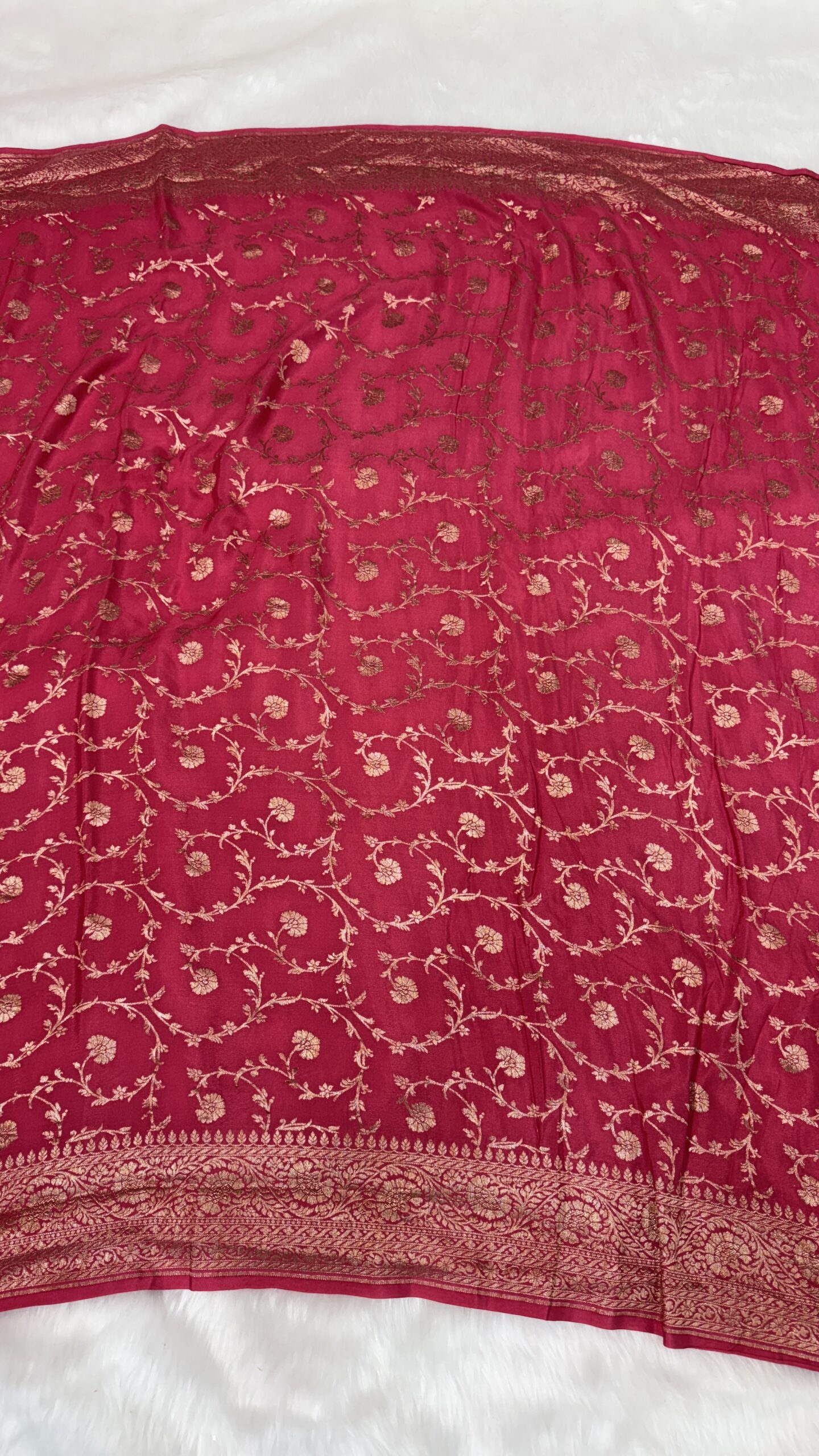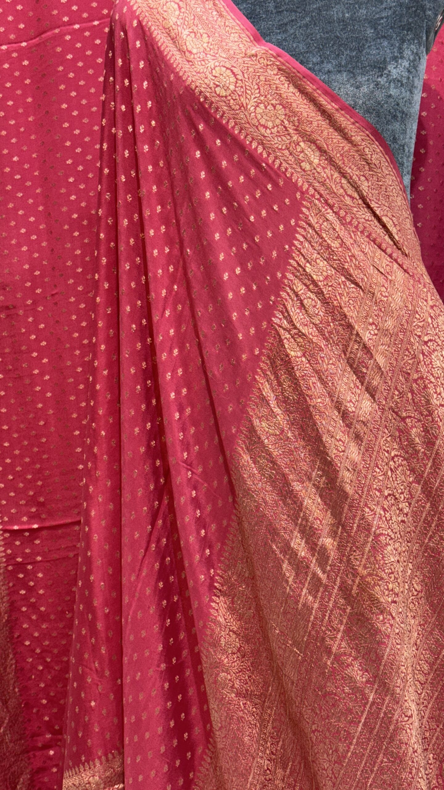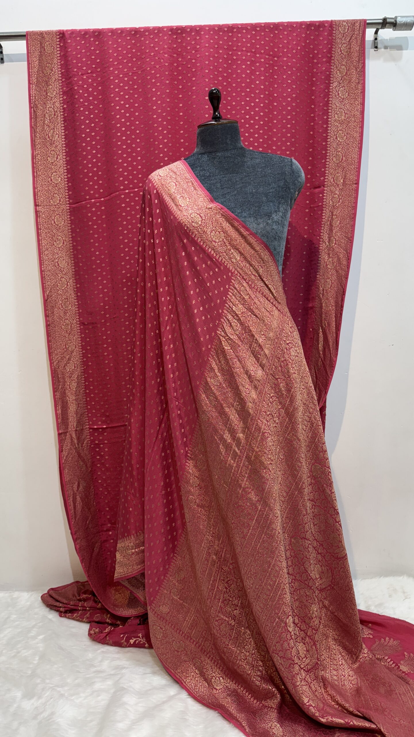 Turn heads with this stunning Italian Crape Georgette Saree, enriched with antique gold zari weaving. The vibrant deep pink base paired with shimmering zari motifs creates a perfect balance of tradition and elegance. Lightweight and graceful, this saree is an ideal choice for weddings, festive gatherings, and grand celebrations.