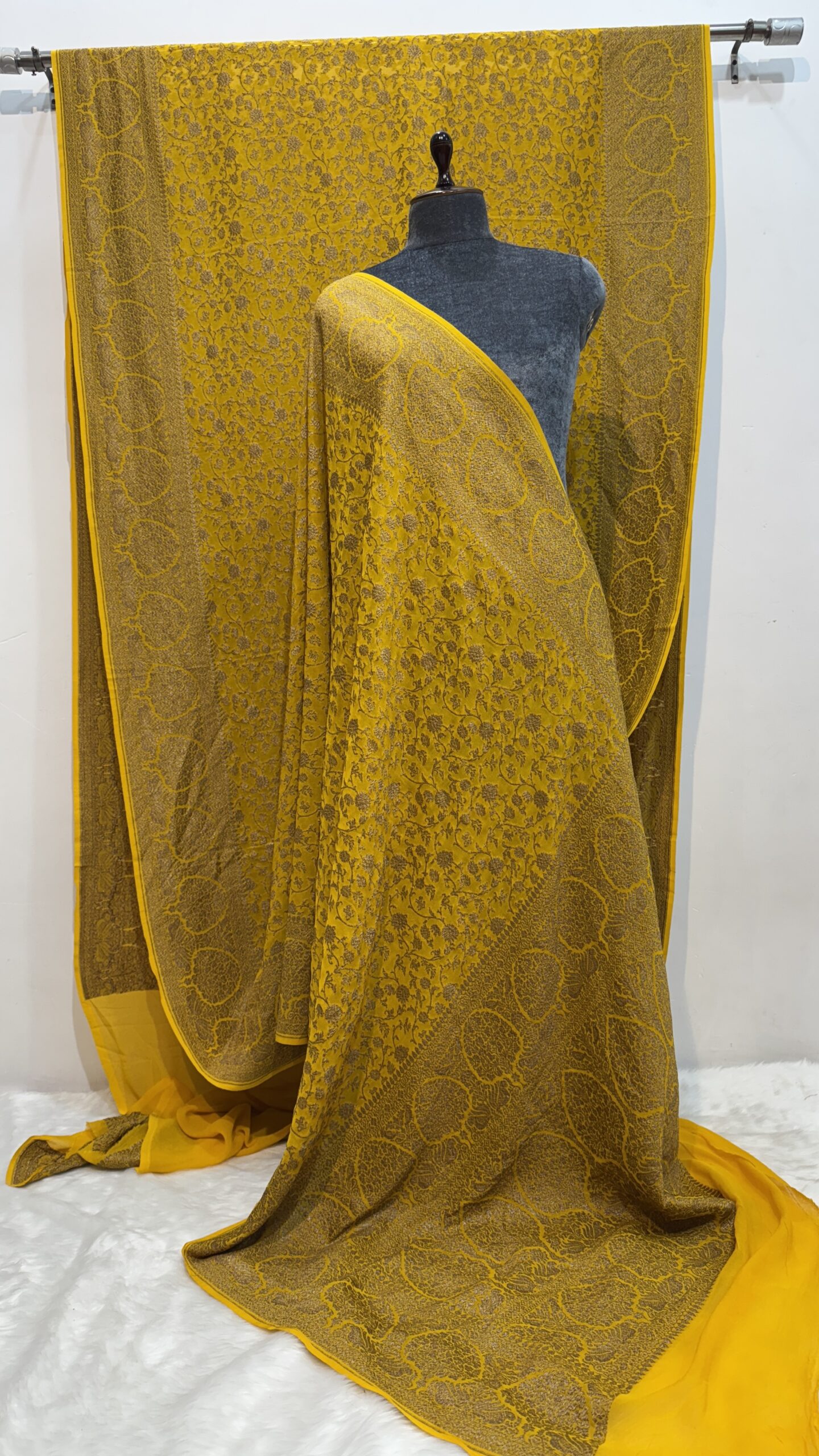 Elevate your elegance with this exquisite Khaddi Georgette saree, beautifully adorned with intricate antique zari weaving. The luxurious mustard-yellow base is gracefully complemented by traditional motifs, creating a timeless fusion of tradition and sophistication.