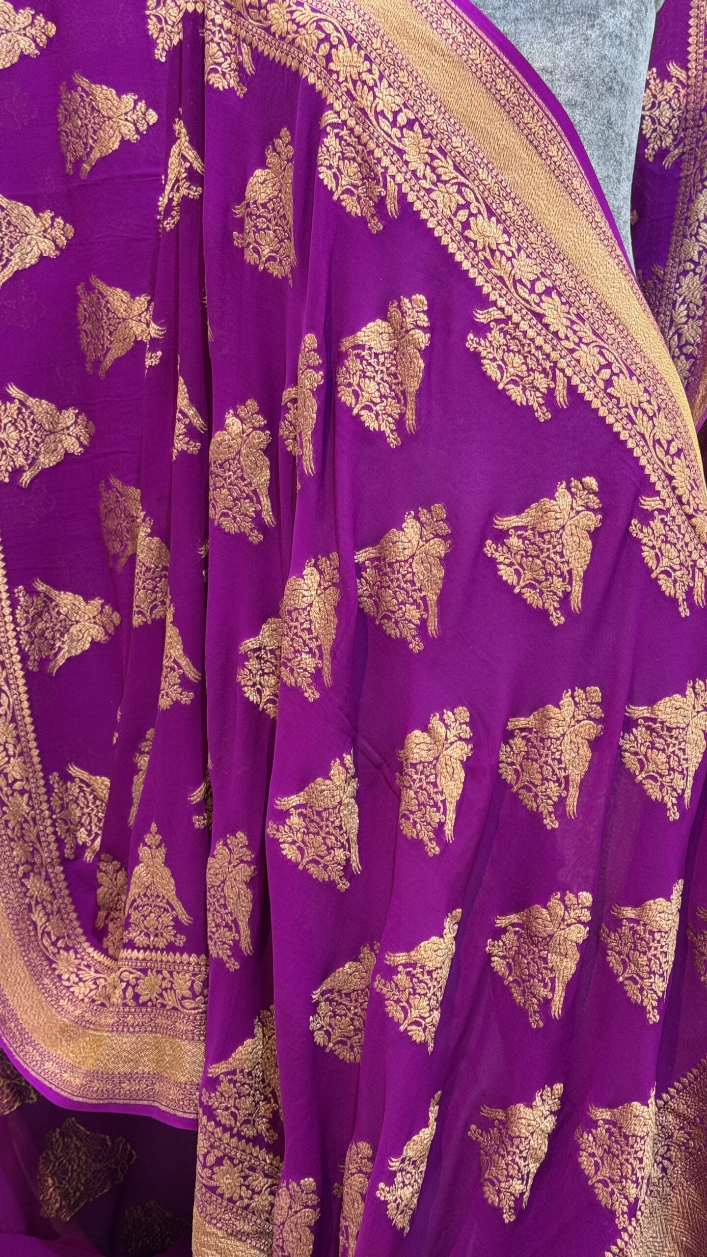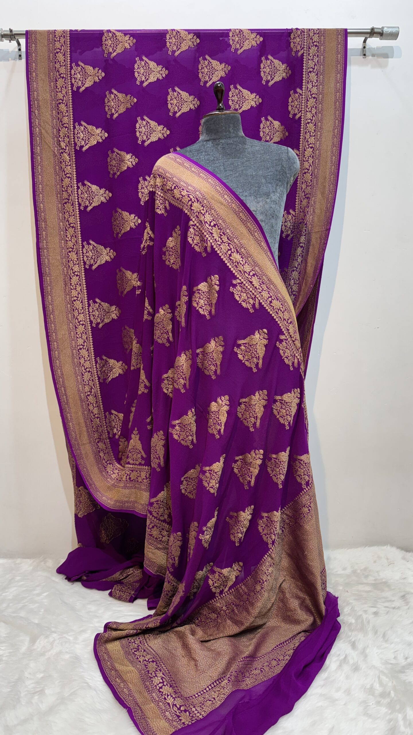 Radiate royal charm with this majestic purple Khaddi Georgette saree, intricately woven with antique zari motifs. The saree features finely detailed golden buttas throughout the body, paired with a beautifully crafted broad zari border and pallu that exude timeless elegance. Lightweight yet luxurious, this saree is perfect for weddings, festive occasions, and grand celebrations where tradition meets sophistication.