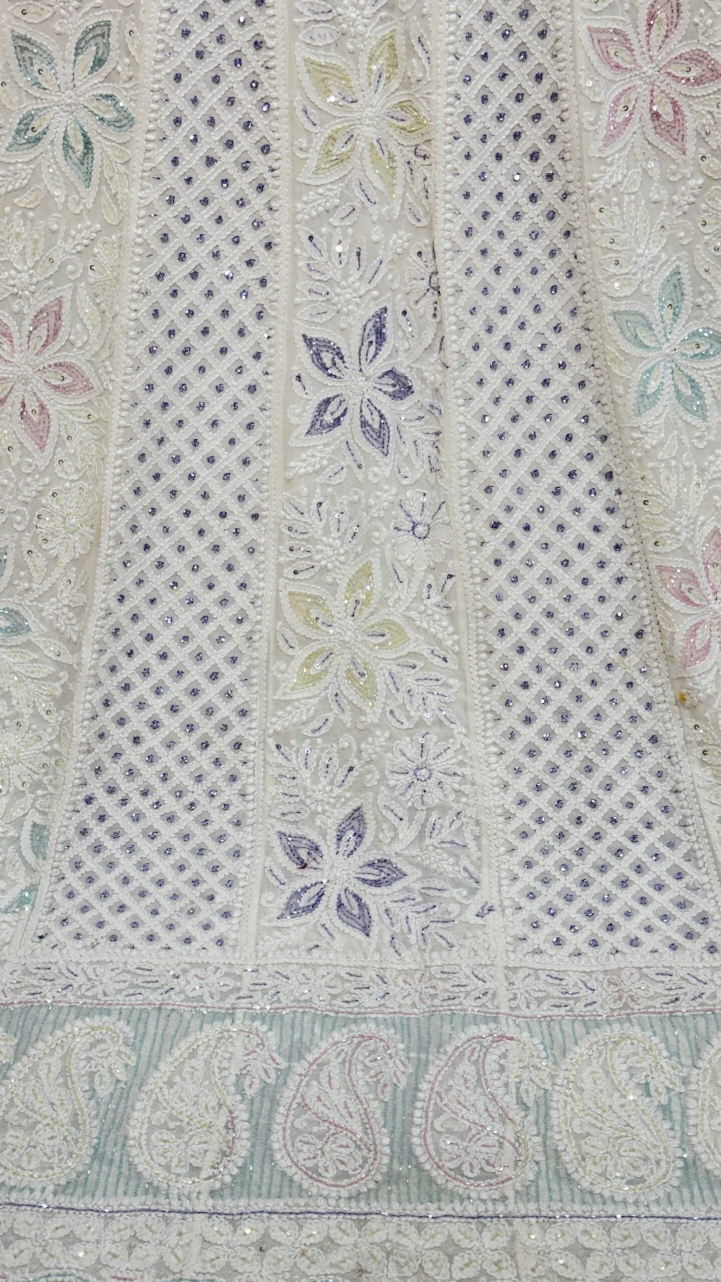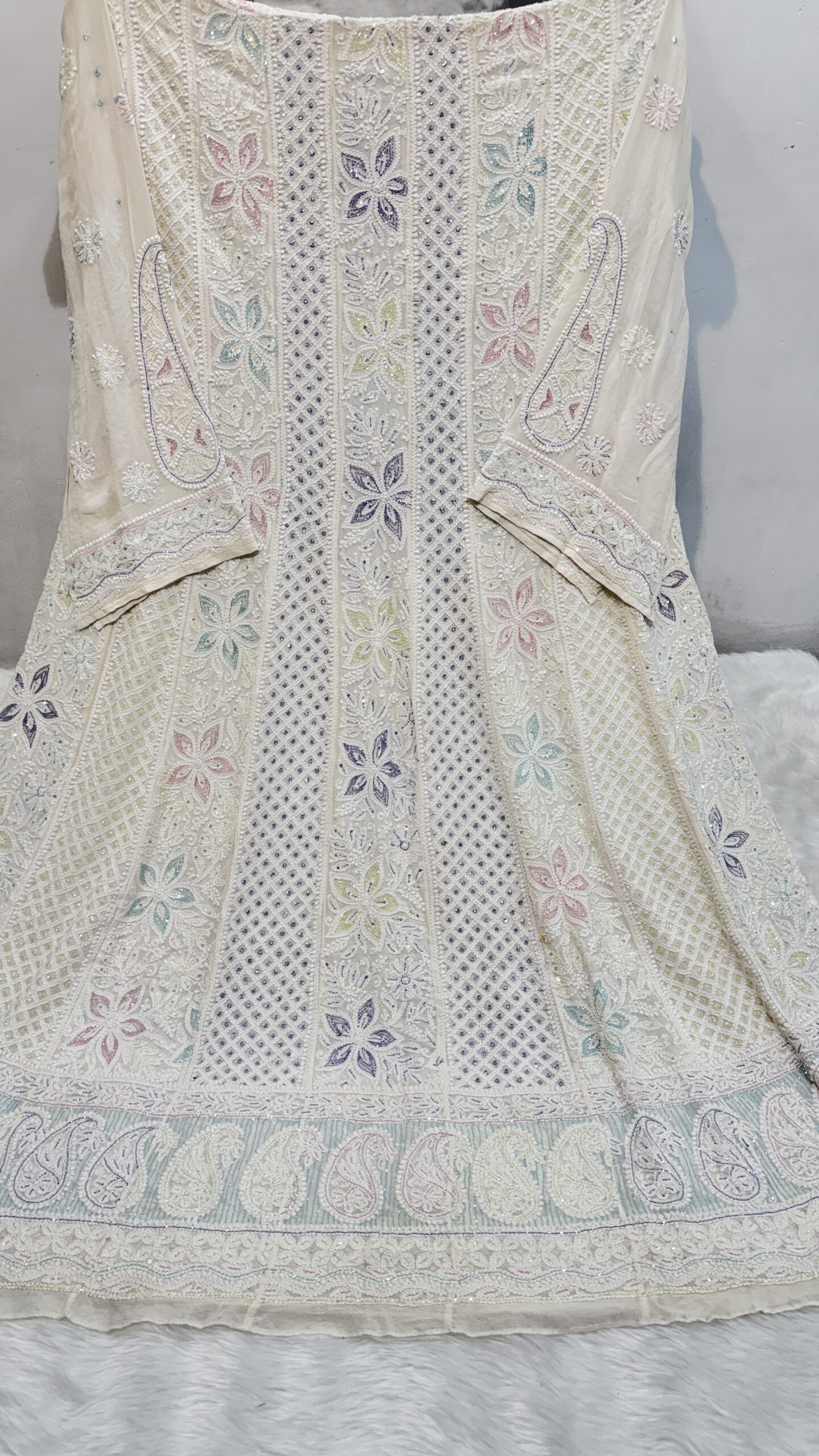 - Step into pure elegance with this stunning Lucknowi Chikankari Anarkali, featuring intricate pāl style embroidery and a graceful full-flare silhouette. The outfit is beautifully handcrafted with detailed Chikankari patterns, complemented by delicate pastel multicolor threadwork and subtle sequin highlights for a premium festive glow.