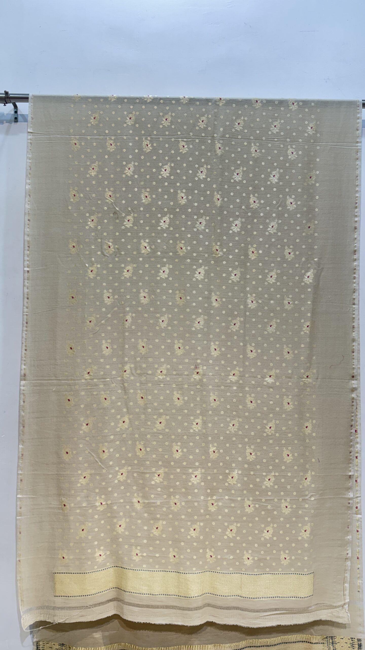 The top is made from rich pure Munga Silk, beautifully adorned with delicate Meena Kari woven motifs that add a graceful charm and traditional appeal. The fabric has a soft texture with a natural sheen, making it perfect for festive occasions and elegant gatherings.