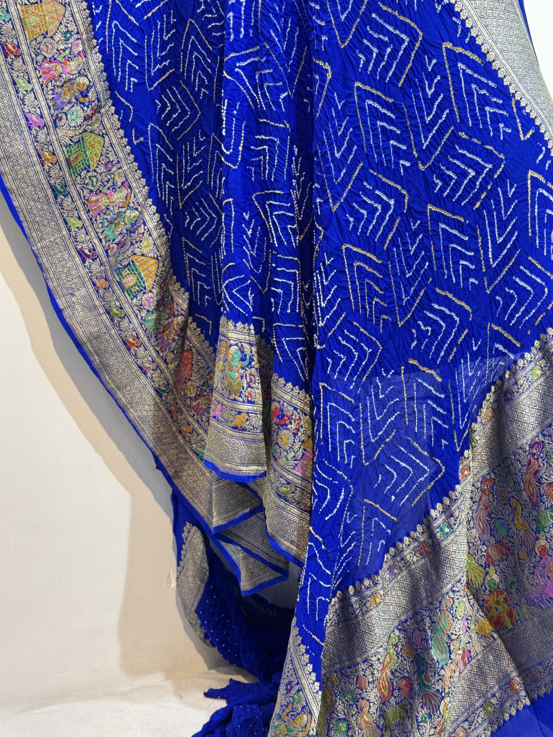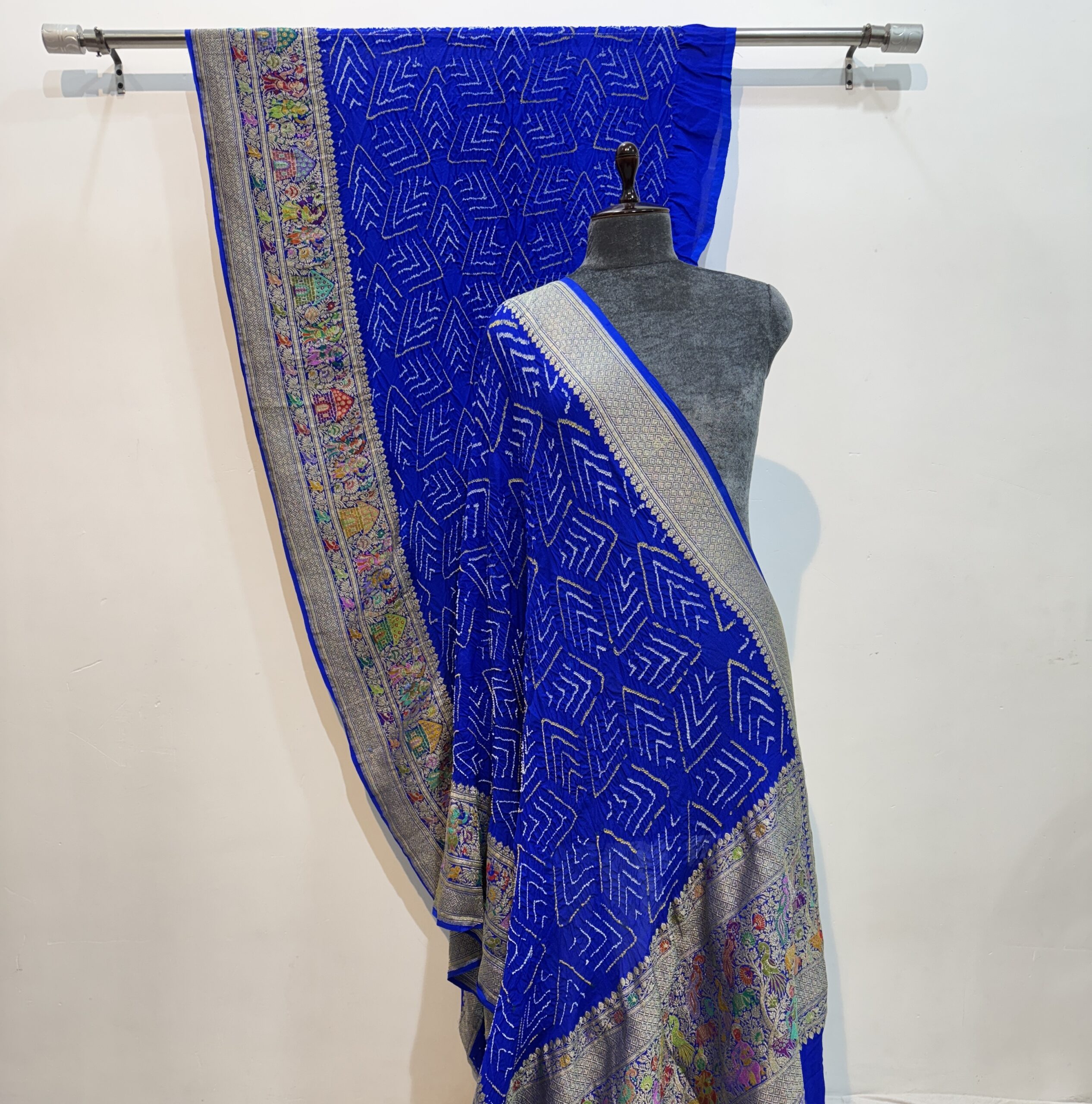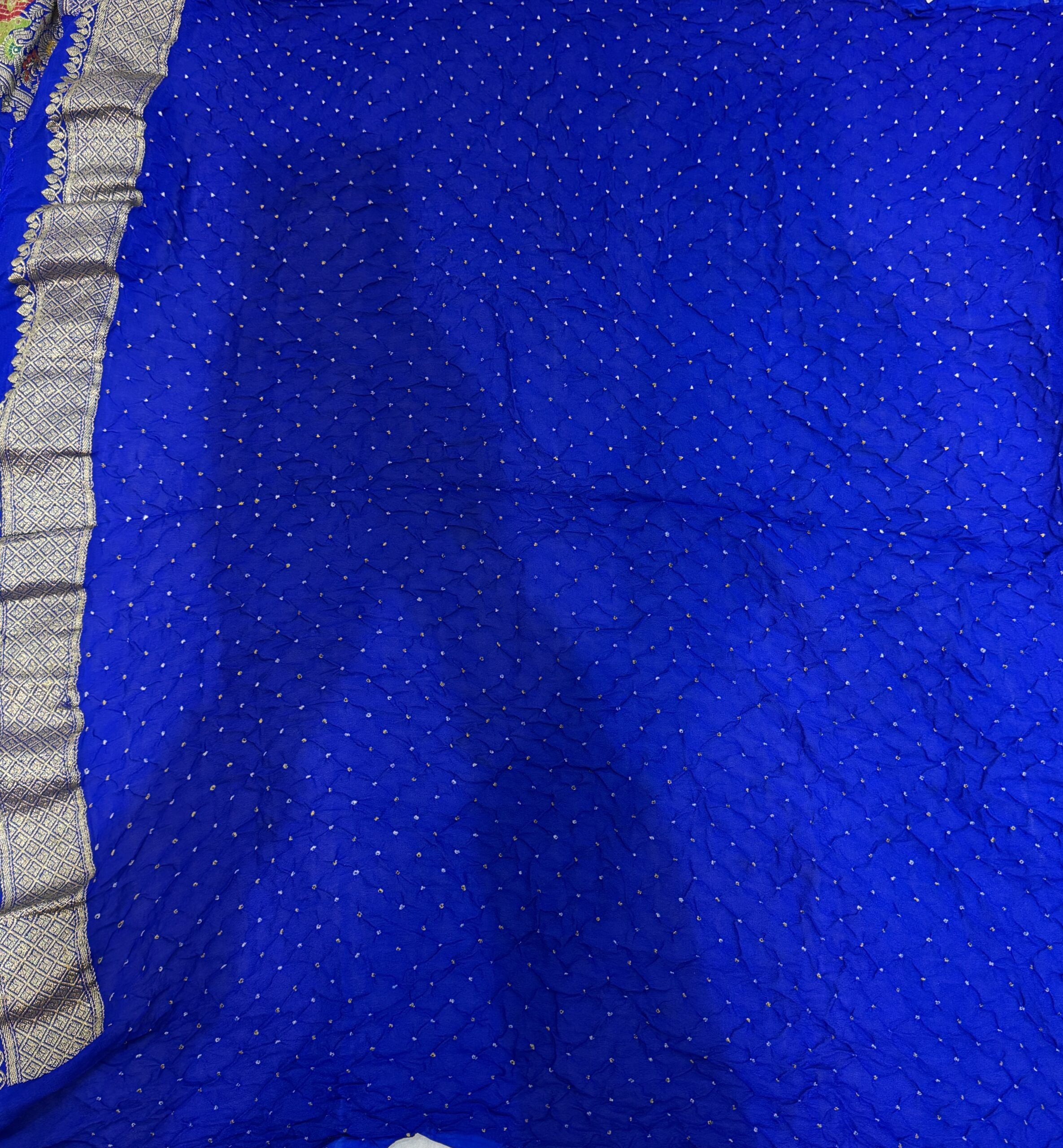 indian art boder figer motive royal blure rai bandhani bandj tasted zari saree