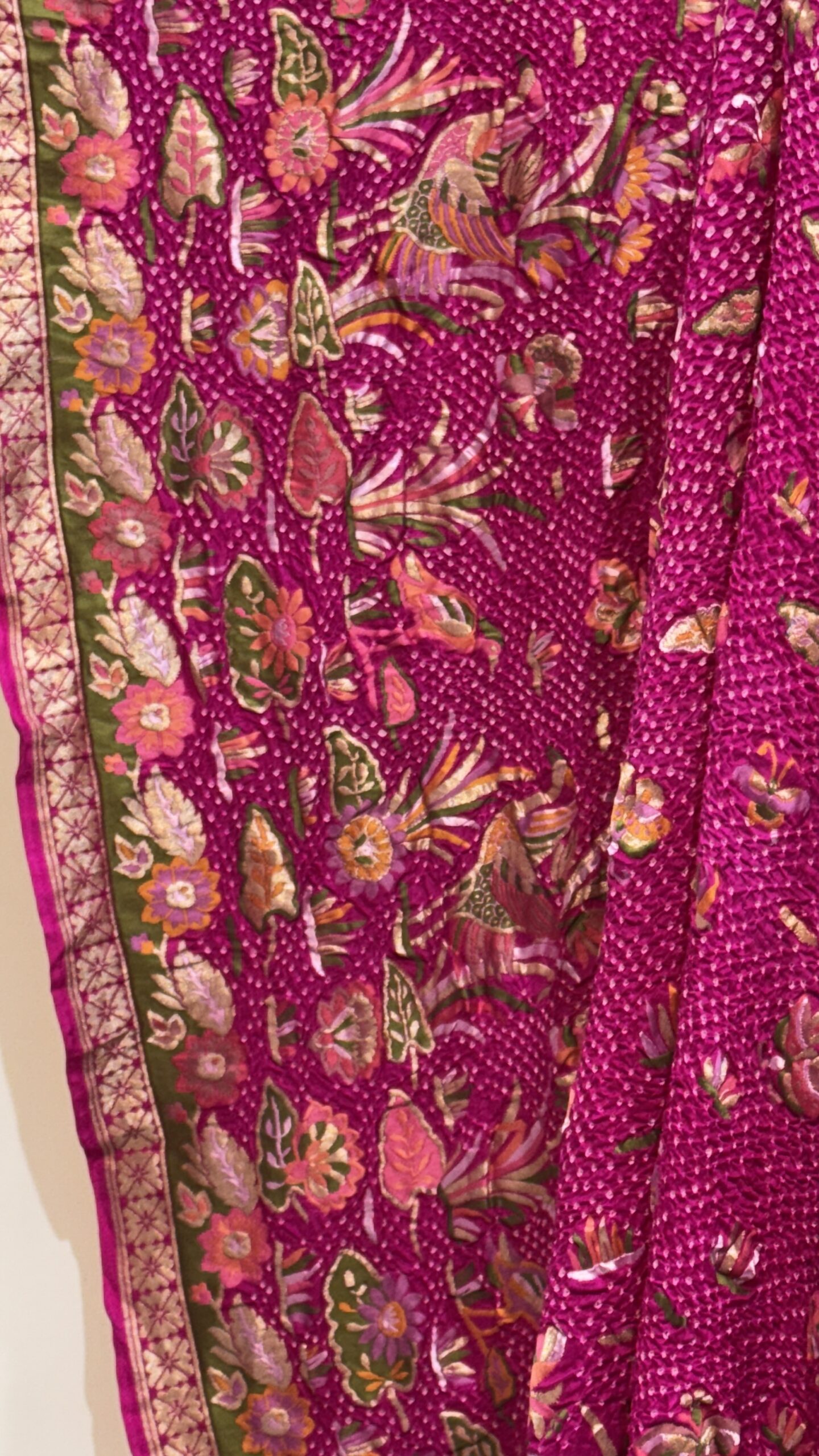 Traditional Rai Bandhej work with intricate patterns and zari detailing